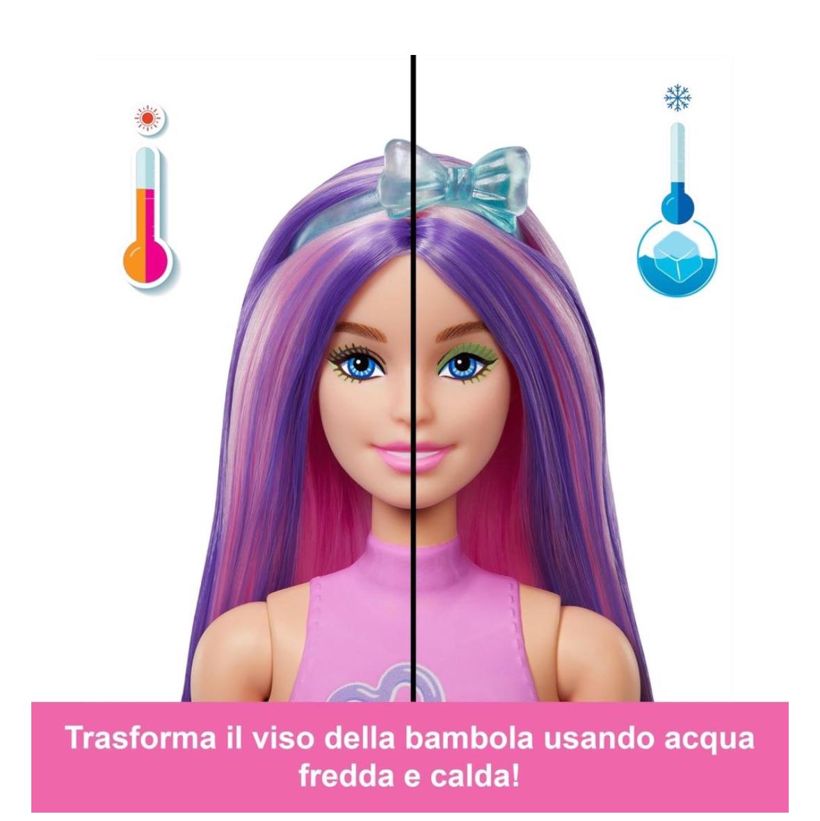- Inizia questa esperienza rimuovendo lo strato esterno della confezione poi svita la parte superiore del tubo ed estrai la bambola Barbie il suo look è nascosto da un rivestimento rosa scintillante Color Reveal e da sacchettini dal contenuto misterioso Riempi il tubo con acqua calda posiziona la bambola all’ interno falla ruotare e toglila per rivelare il suo look Quale bambola troverai Apri le borse per scoprire gli accessori alla moda una gonna con una colorata stampa di palloncini a forma di animale un cerchietto per capelli scarpe con plateau di tendenza e un variopinto palloncino a forma di animale Usa l acqua fredda e calda per trasformare il corpetto della bambola tutte le volte che vuoi.