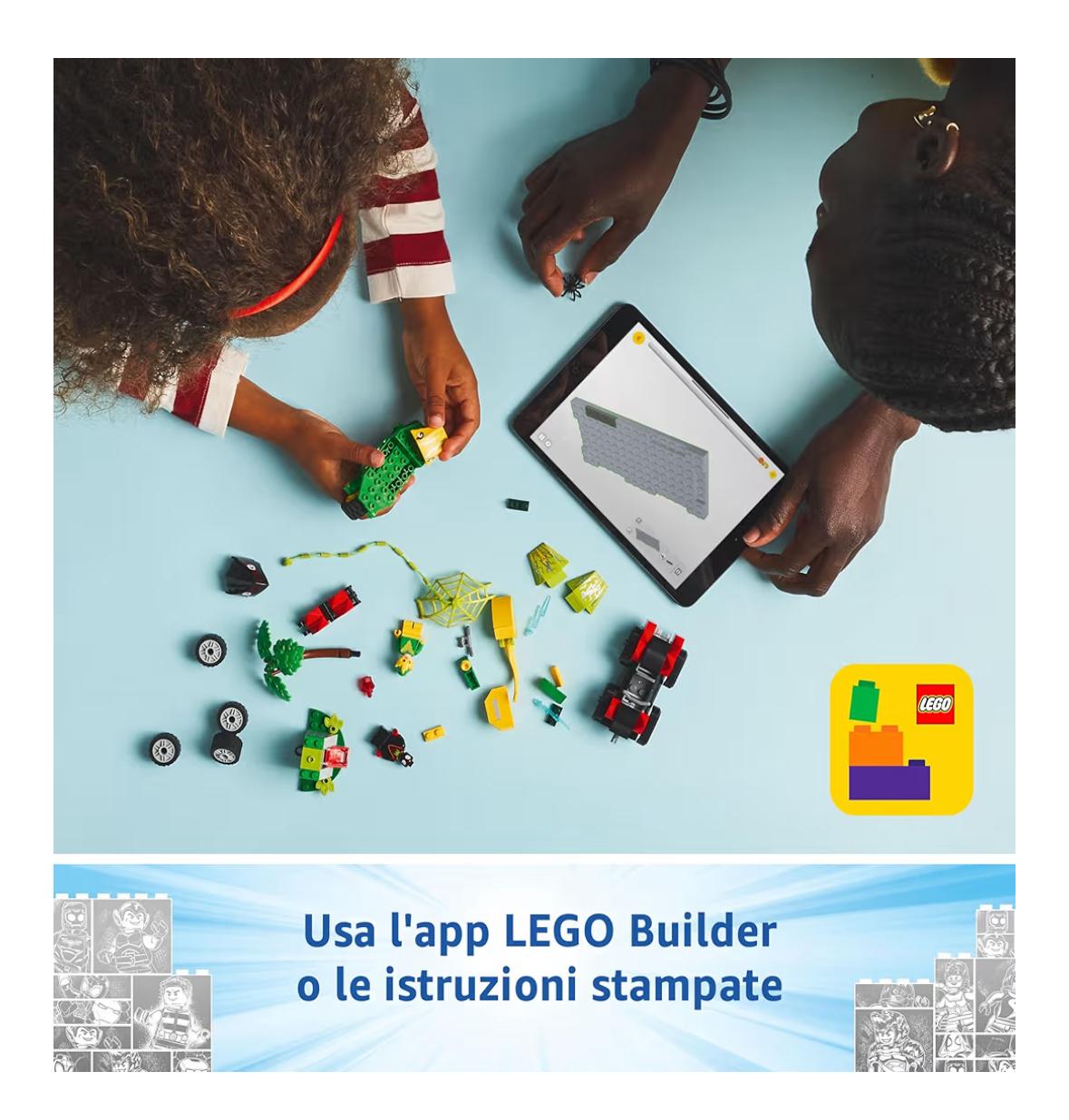 - Dino-veicoli giocattolo da costruire con le minifigure LEGO di Spin ed Electro: il set include una moto e una macchina giocattolo da costruire, oltre ad una guida e un grande Starter Brick con cui iniziare rapidamente i giochi di ruolo.