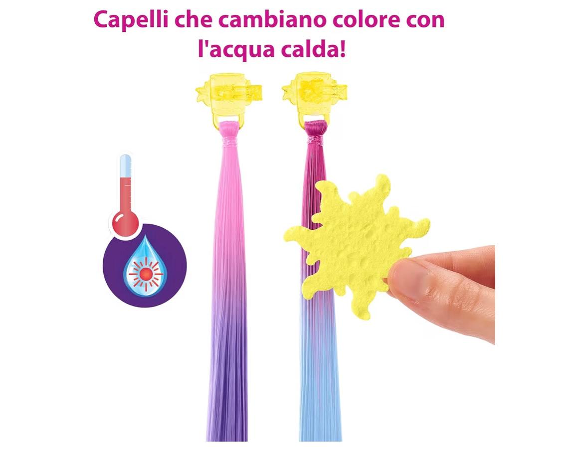 - Ispirata al personaggio animato Disney, questa bambola ha 2 extension per capelli che cambiano colore con l’acqua calda, dal viola al rosa o dal rosa al blu.