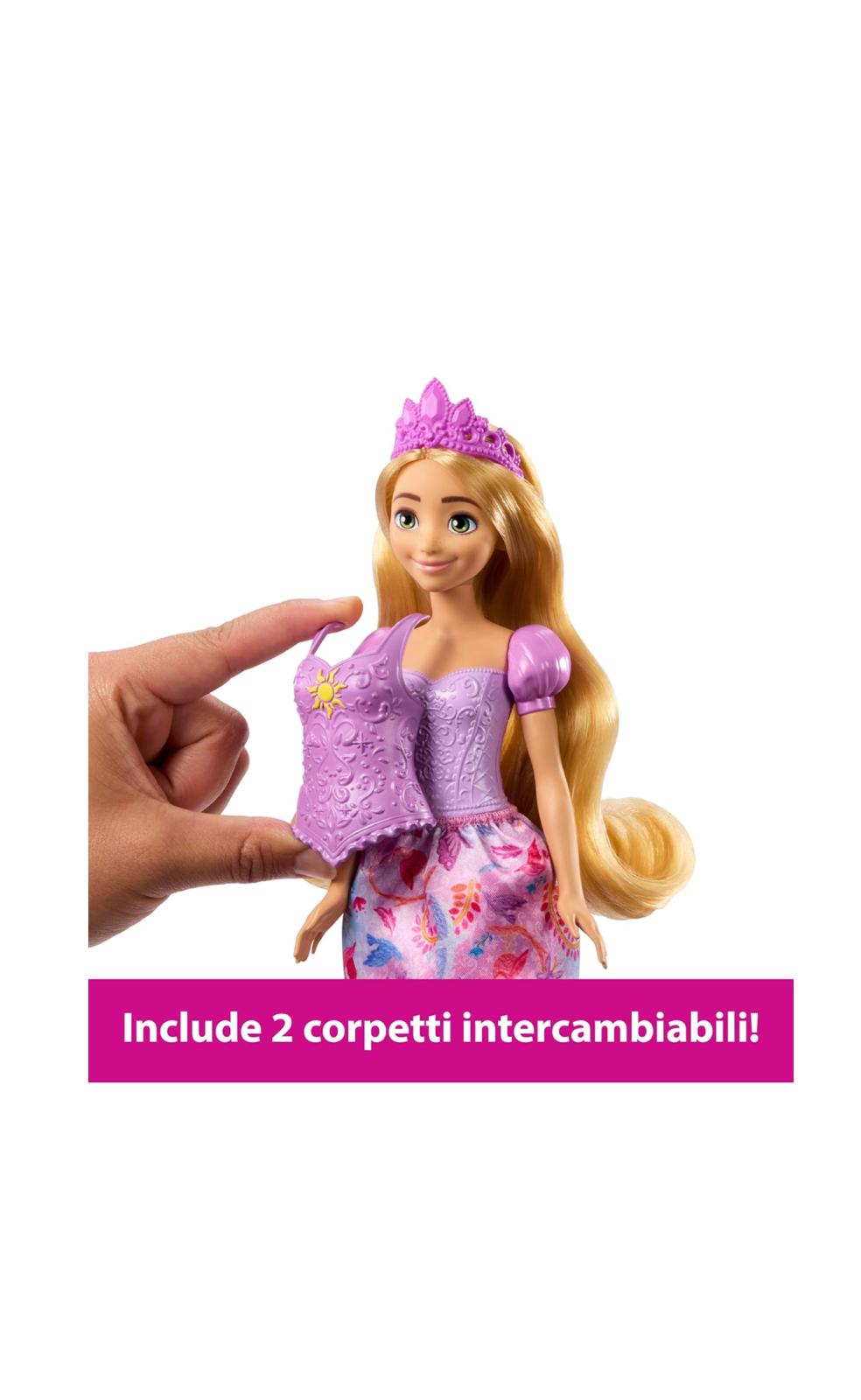 - Mattel Disney Princess – Rapunzel 2 storie in 1, bambola alla moda ispirata al film Rapunzel con 2 look completi intercambiabili e 9 accessori inclusi. (194735259137)