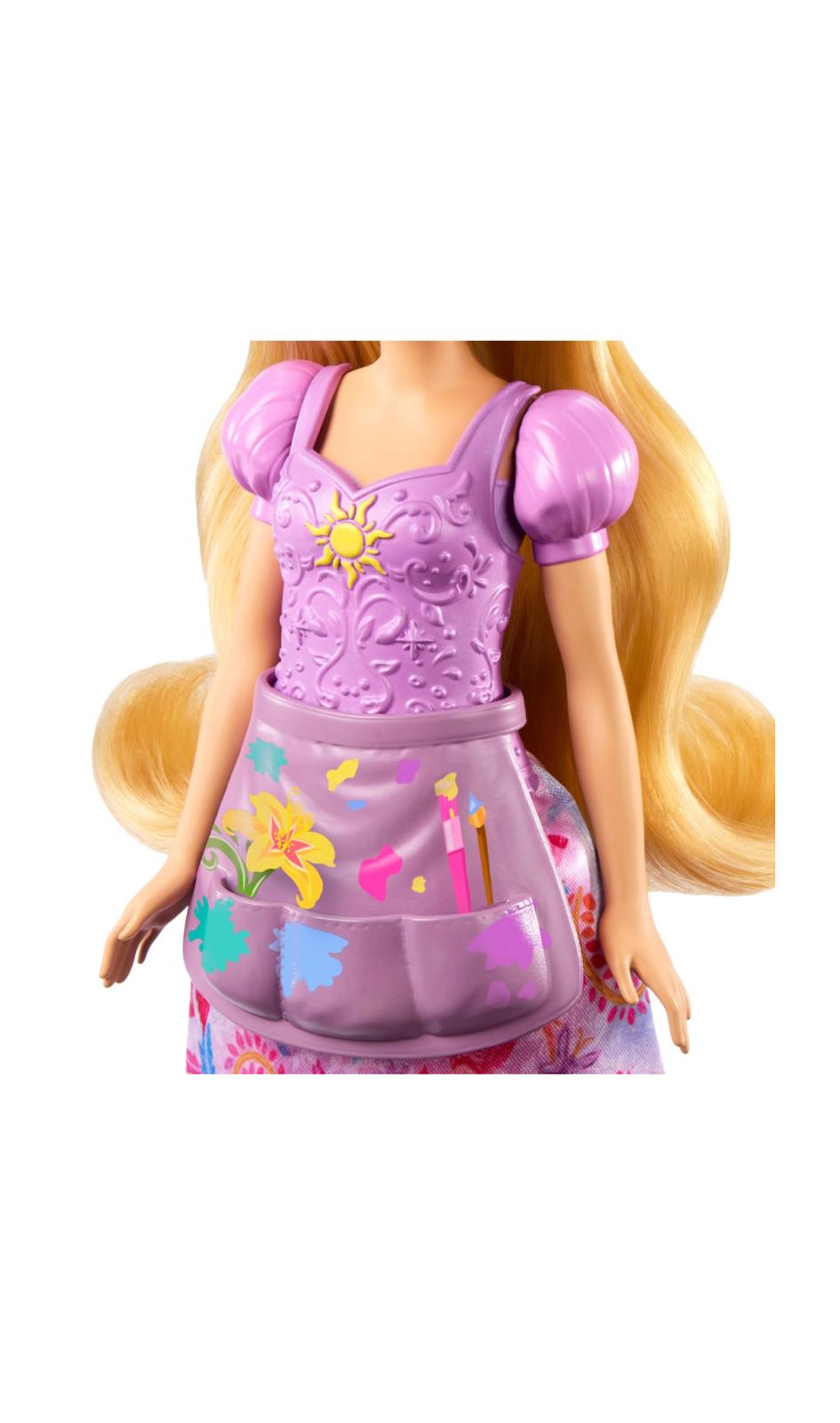 - Questa bambola Rapunzel, facile da vestire, è dotata di due corpetti intercambiabili e di due gonne con le icone stampate delle sue storie.