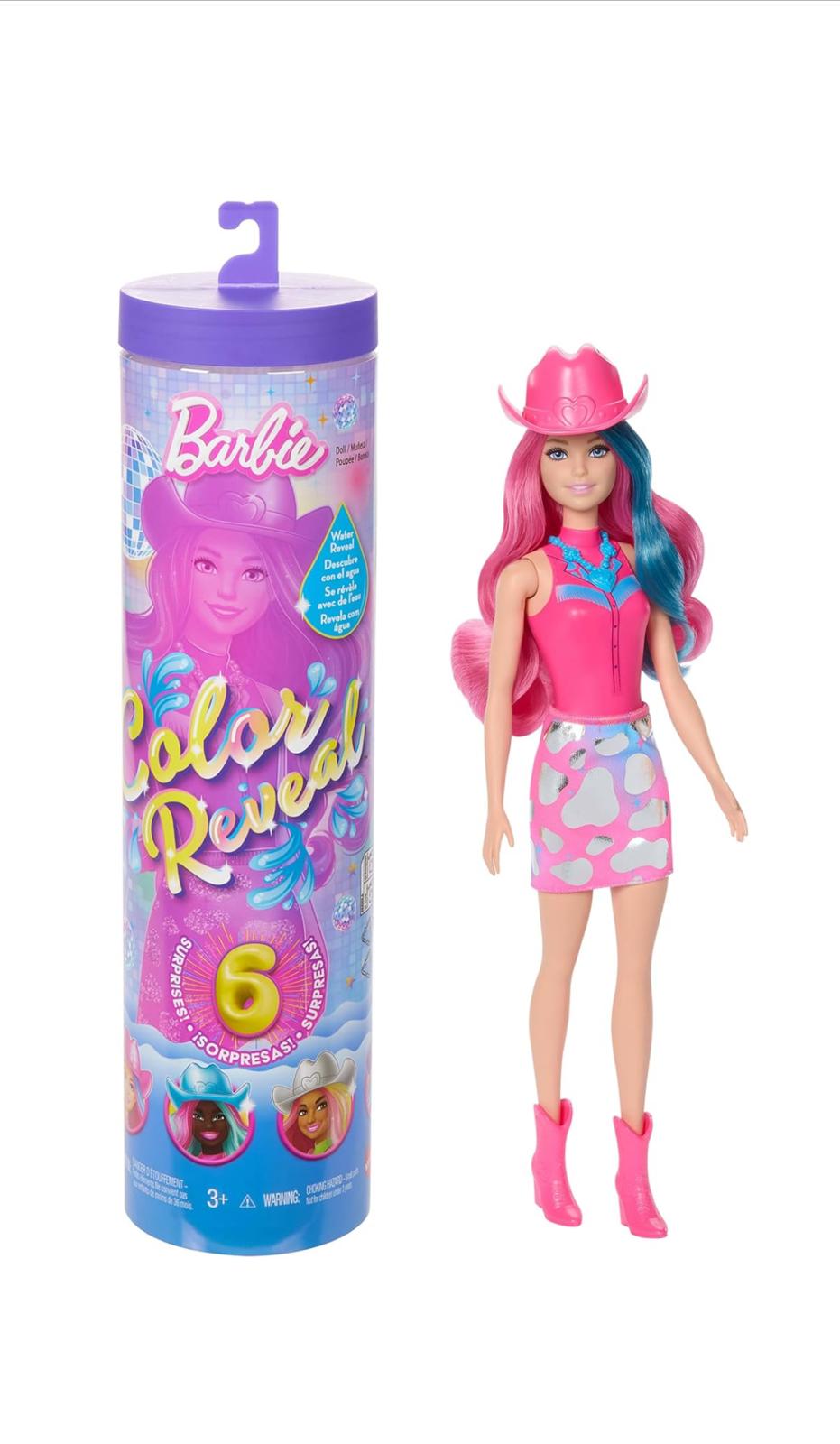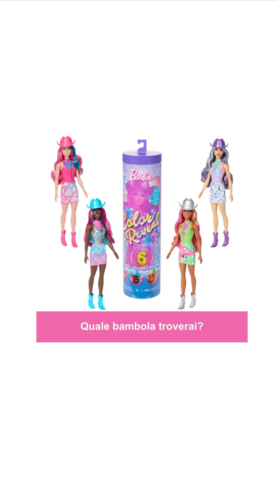 - Barbie – Color Reveal Serie Country Chic, bambola a sorpresa con corpetto scintillante metalizzato e 6 accessori inclusi, effetto cambia colore, giocattolo per bambini, 3+ anni. (194735273966)
