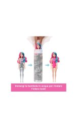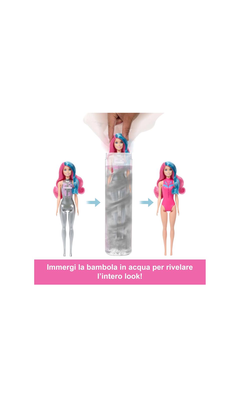 - Inizia questa esperienza rimuovendo lo strato esterno della confezione, poi apri il tubo ed estrai la bambola Barbie: il suo look è nascosto da un rivestimento scintillante Color Reveal!