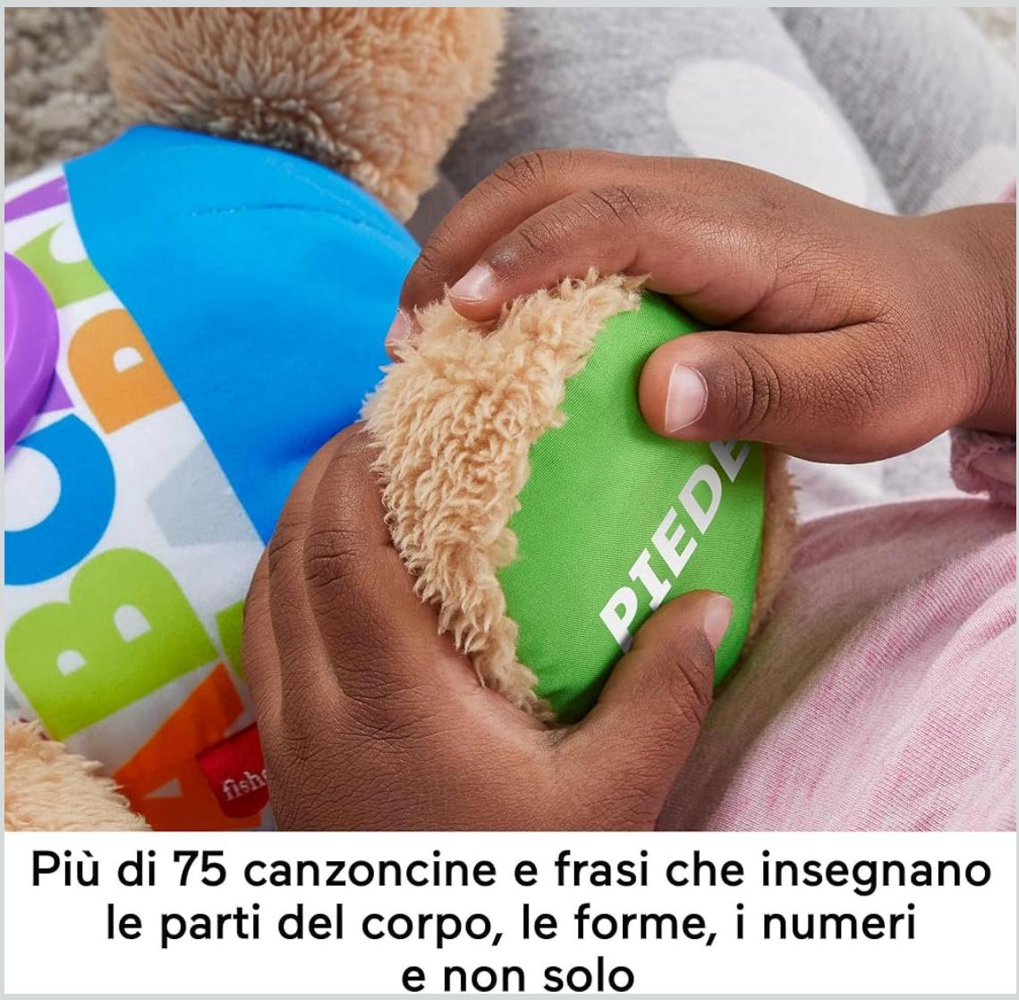 - Risponde al tocco del bambino con adorabili canzoncine e frasi che introducono oltre 100 paroline da imparare, parti del corpo, colori, forme e tanto altro!
