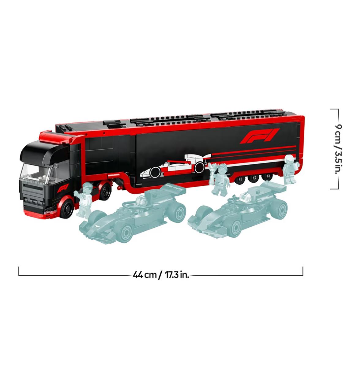 • Come nel mondo reale: il rimorchio è dotato di un simulatore di Formula 1 e di doppio vano per veicoli con pannelli laterali apribili, un portello posteriore e rampe per caricare i modelli di auto Red Bull LEGO e l’Aston Martin giocattolo.