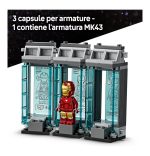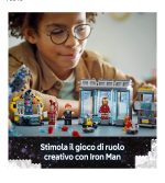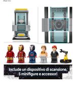 - Azione e avventura di Iron Man: il laboratorio contiene 3 capsule di armature collegabili alle precedenti versioni di giochi LEGO | Marvel, una piattaforma di manutenzione con 2 bracci ‘robotici’ e un dispositivo di scansione, oltre a 2 shooter.