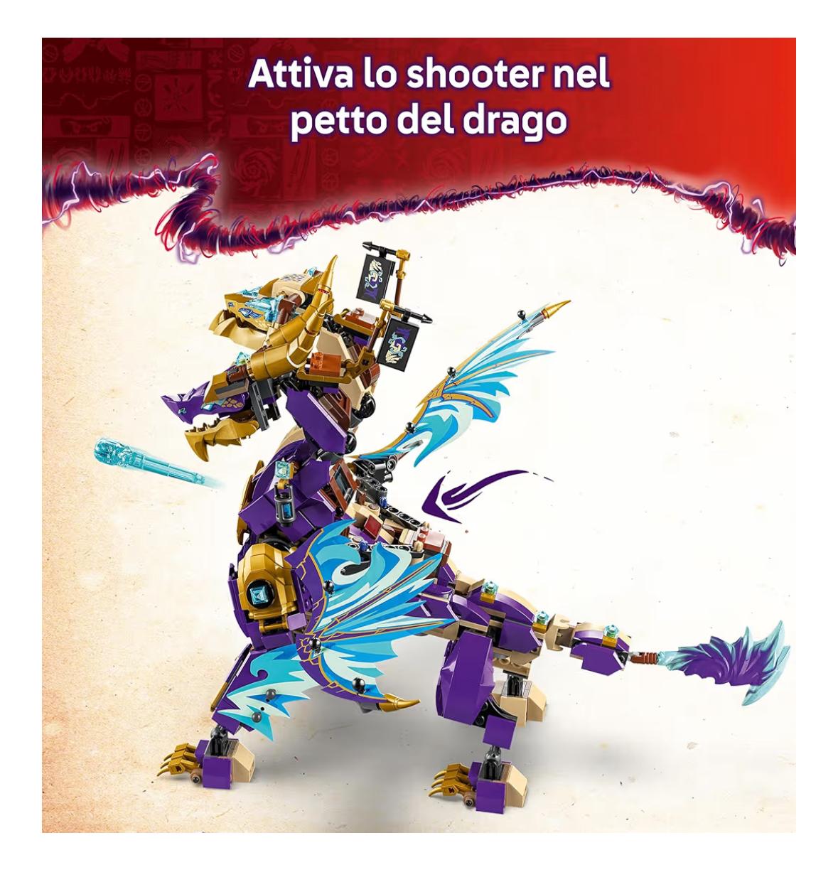 - Figure di drago LEGO NINJAGO snodabile: questo giocattolo NINJAGO d’azione è dotato di coda, gambe, piedi, testa, collo, mascella e artigli snodabili, oltre che di uno shooter nel petto e di ali azionabili tramite una leva sul dorso del Drago NINJAGO.