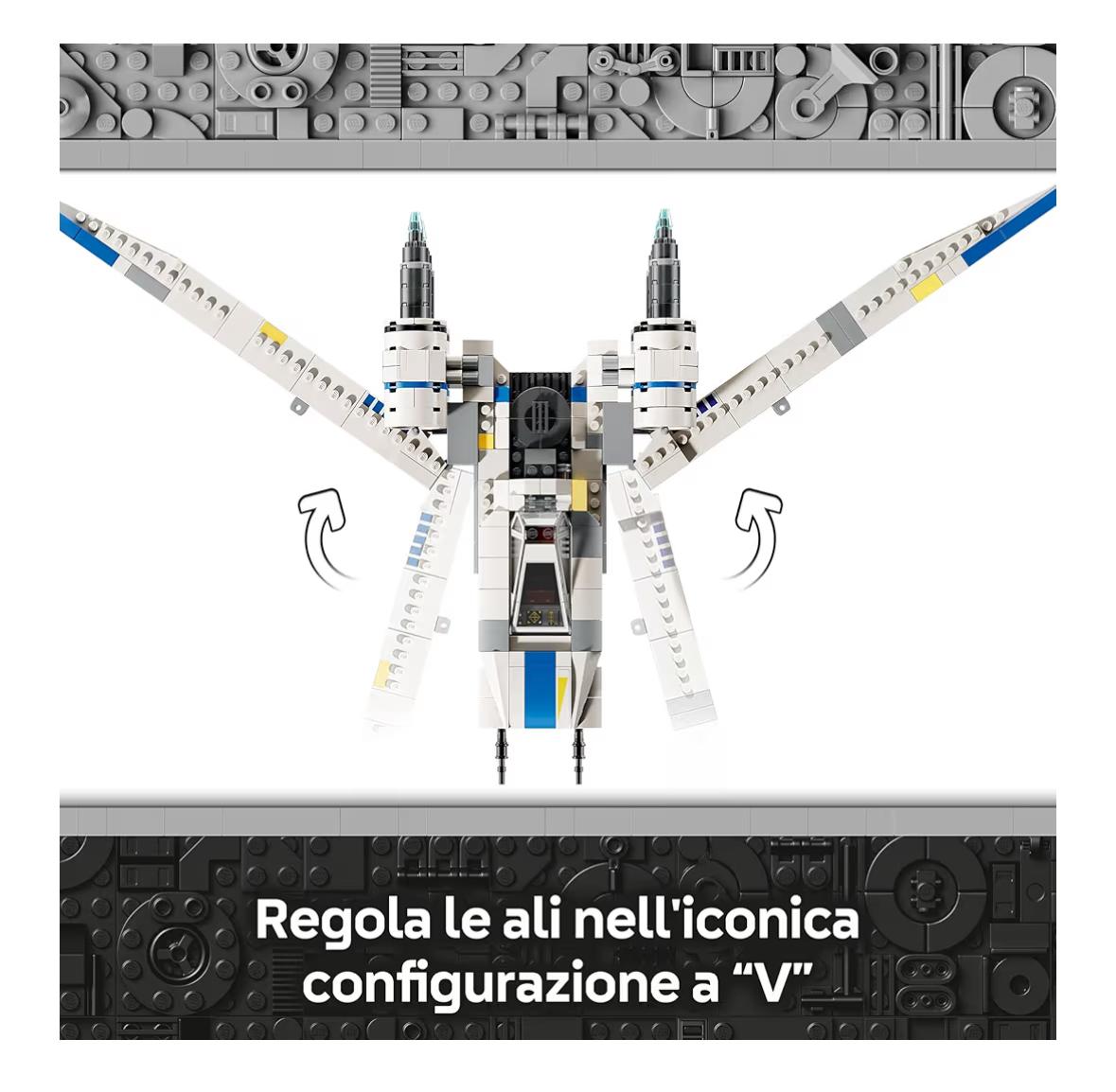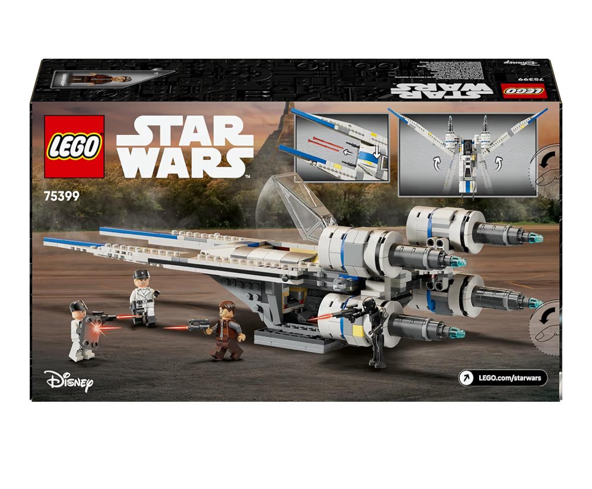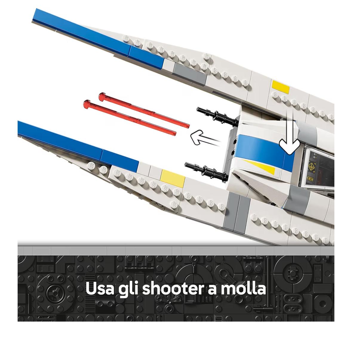 - Tutti a bordo dell’astronave giocattolo: lo starfighter U-wing è dotato di cabina di pilotaggio con tettuccio apribile (azionato da un elemento LEGO Technic), di 2 shooter a molla e di un vano laterale per passeggeri e merci
