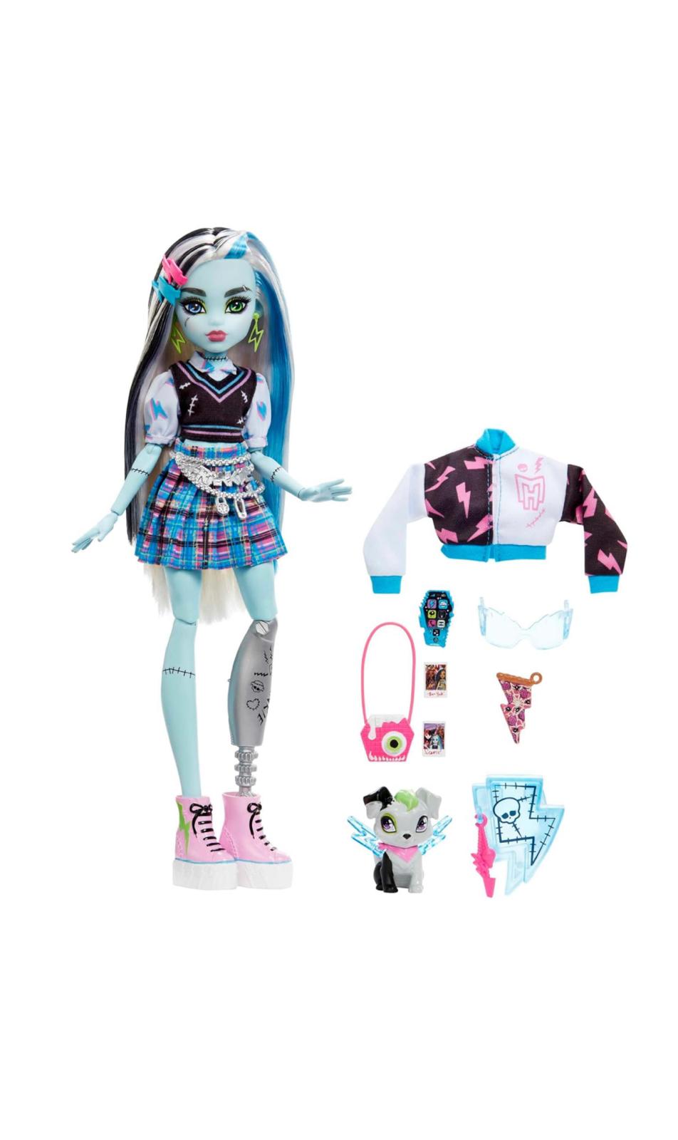 - Porta il look della bambola Frankie Stein a un livello superiore con una giacca da urlo in stile college e accessori mostruosamente fantastici, come lo zainetto a forma di fulmine, la macchina fotografica, lo spuntino alla pizza e lo smartphone.