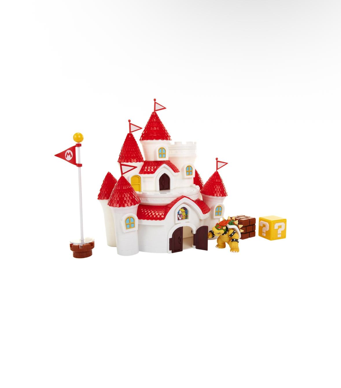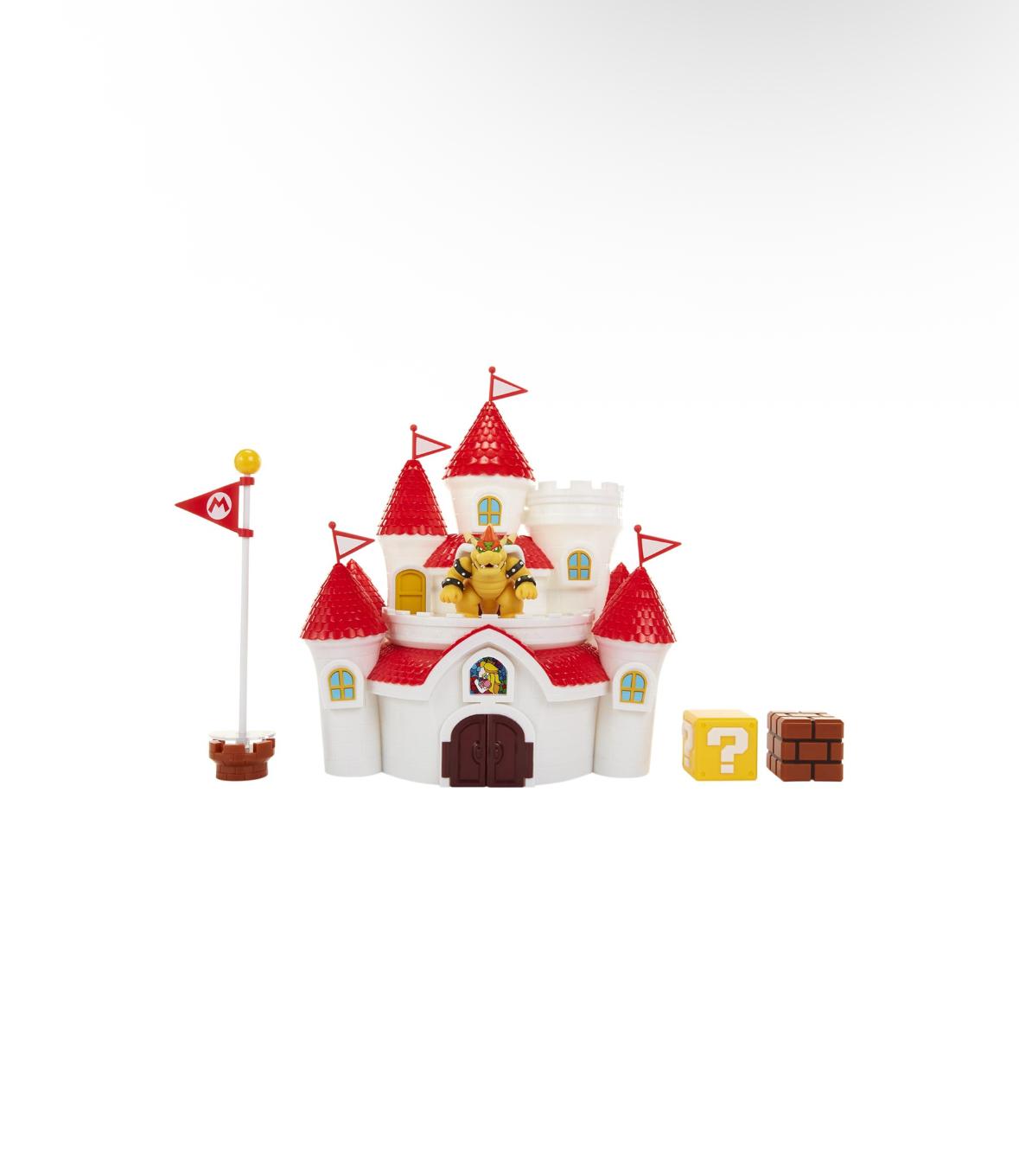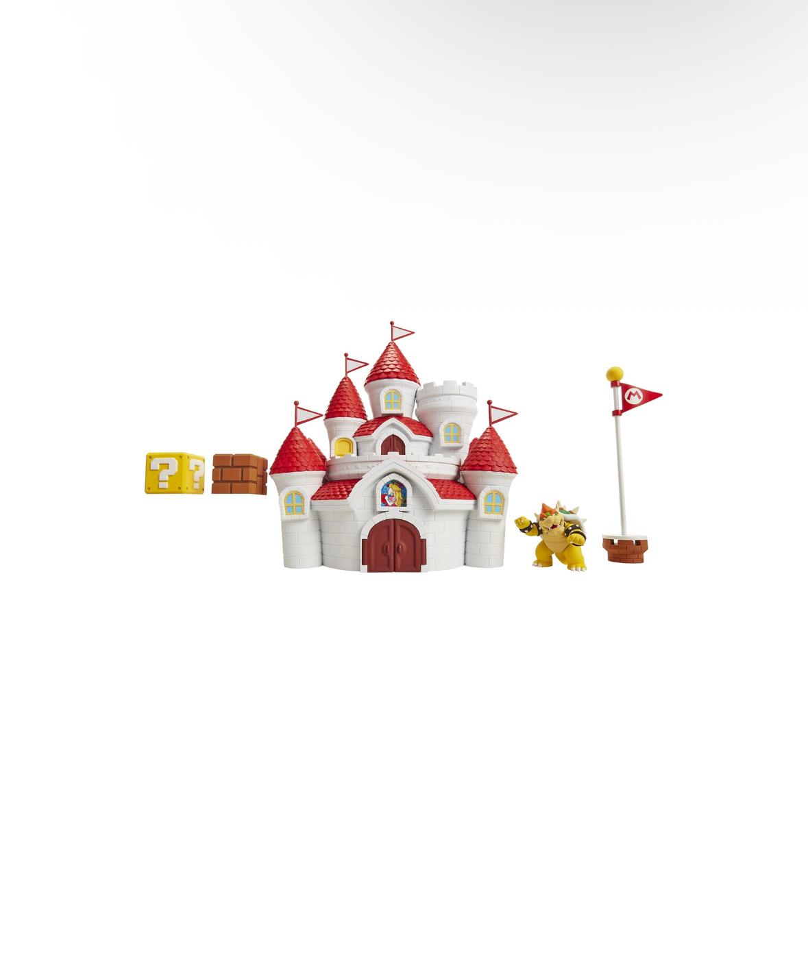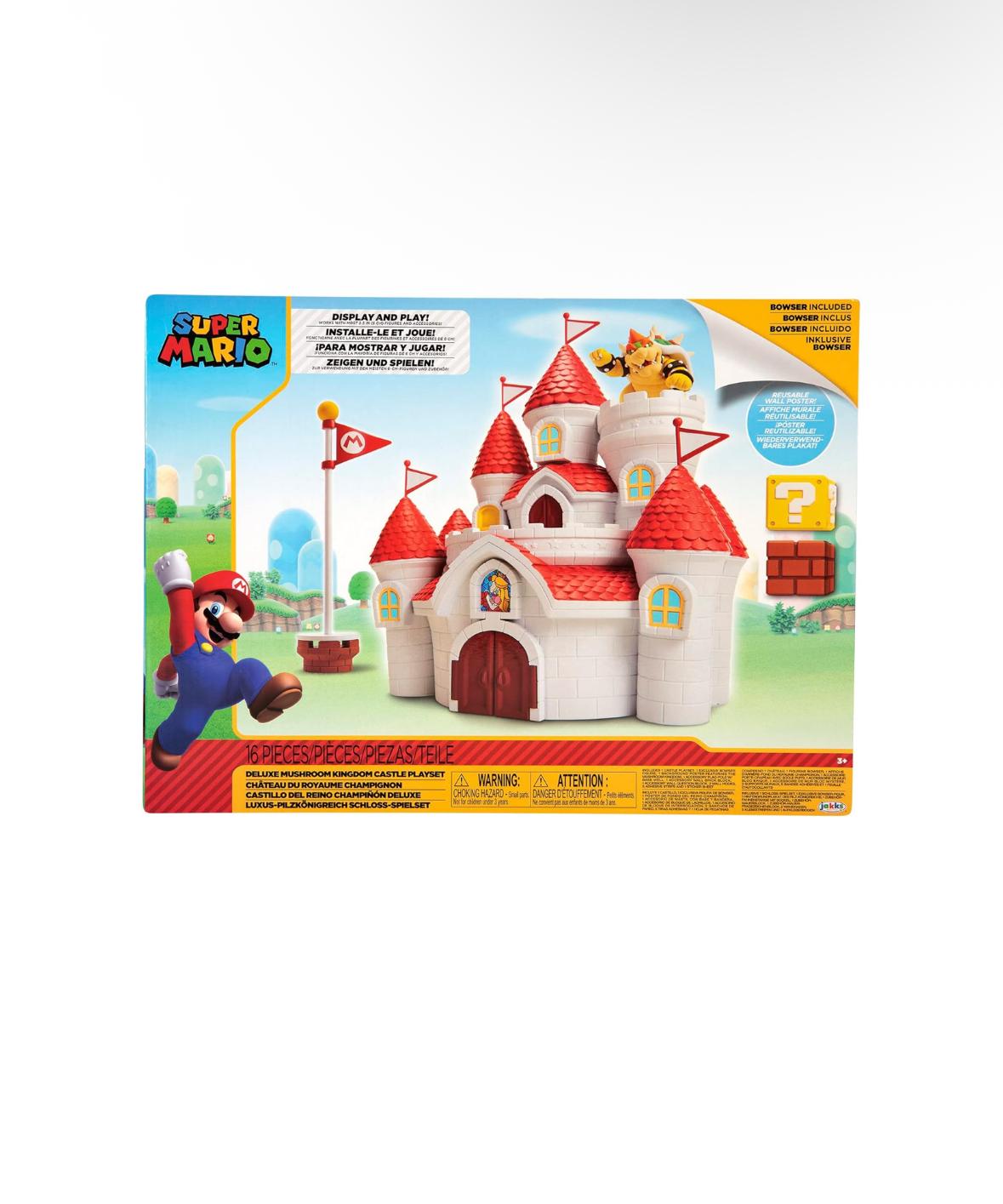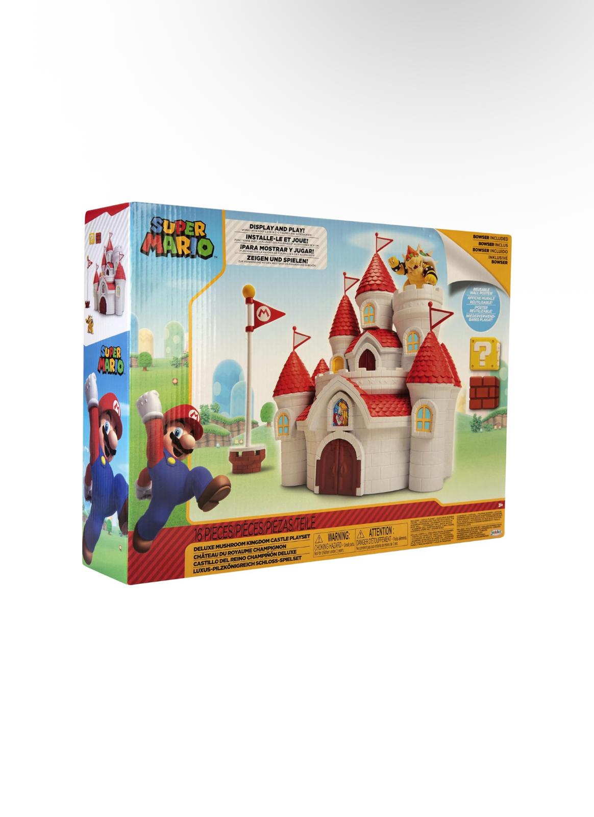 • Il Playset include il Castello della Principessa Peach, un poster da parete del Regno dei Funghi, un’esclusiva figura di Bowser, accessori bonus.